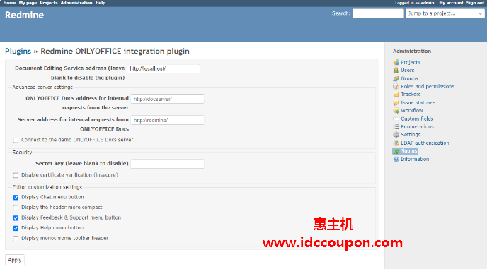 下一步要求你配置ONLYOFFICE连接器。登录Redmine平台,访问管理面板,然后找到插件。在Redmine部分的ONLYOFFICE集成插件中,单击“Configure”。你将看到这些参数和一些附加的自定义选项: