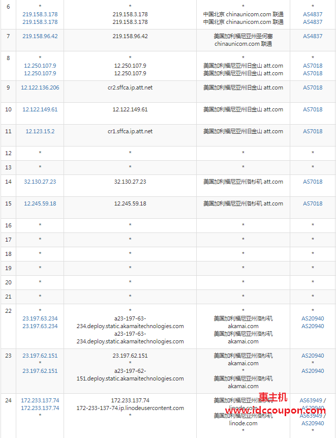 联通去程路由节点测试,联通AS4837线路直连杉矶节点,然后转ATT去机房: