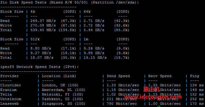 磁盘I/O读写以及iperf3欧美地区速度测试(IPv4)结果如下: