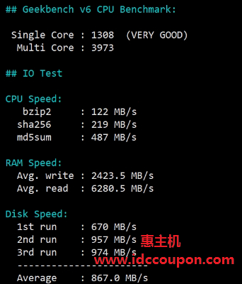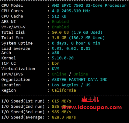 测试方案配置如下:AMD EPYC 7502(主频2.5GHz、32核、64线程),4GB内存、50GB硬盘,已经开启BBR加速,I/O读写大致在800MB/S左右: