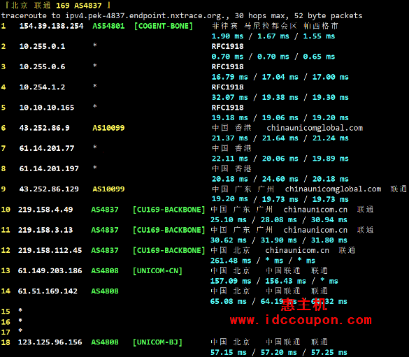 联通去程路由节点测试,联通AS4837直连香港节点,然后到达马尼拉机房: