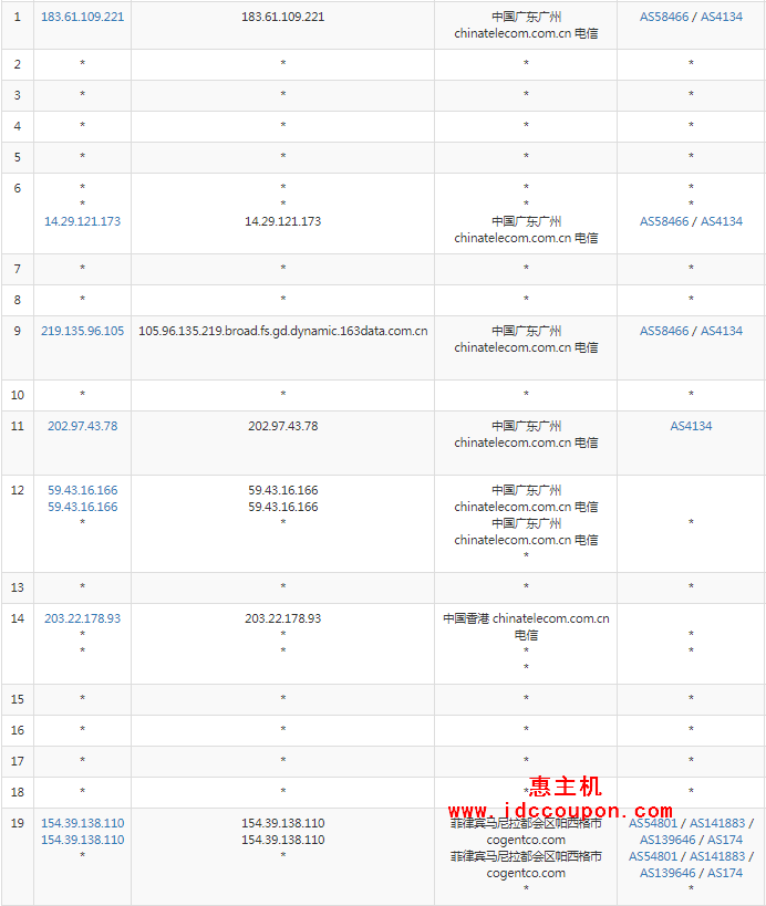电信去程路由节点测试,电信163骨干网直连香港节点,然后转cogentco网络到达马尼拉机房: