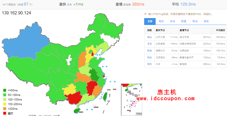 国内部分地区上传和下载速度测试,平均延迟129ms的样子,看出来应该不是直连线路: