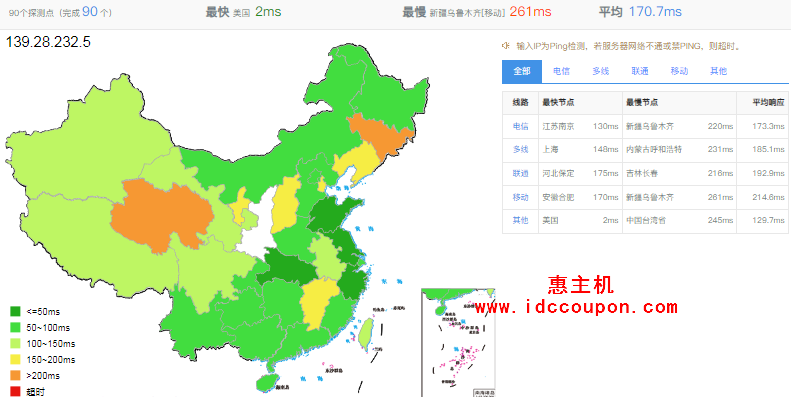 国内部分地区ping延迟测试,平均延迟在170ms的样子,可以看出路由优化这块还是挺不错的: