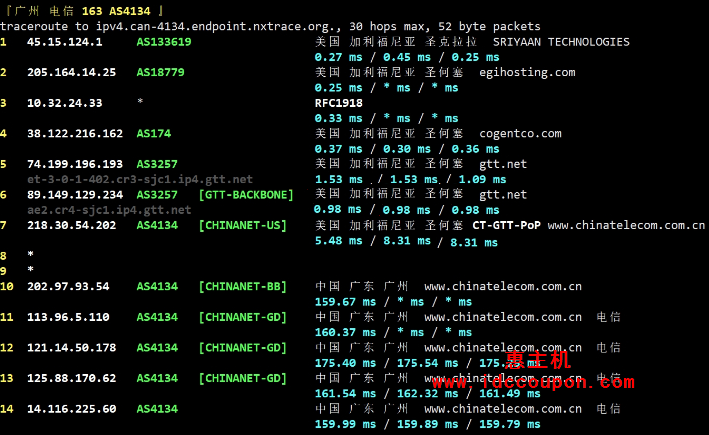 电信去程路由节点测试,电信163骨干网直连圣何塞节点,然后转gtt线路到达机房:
