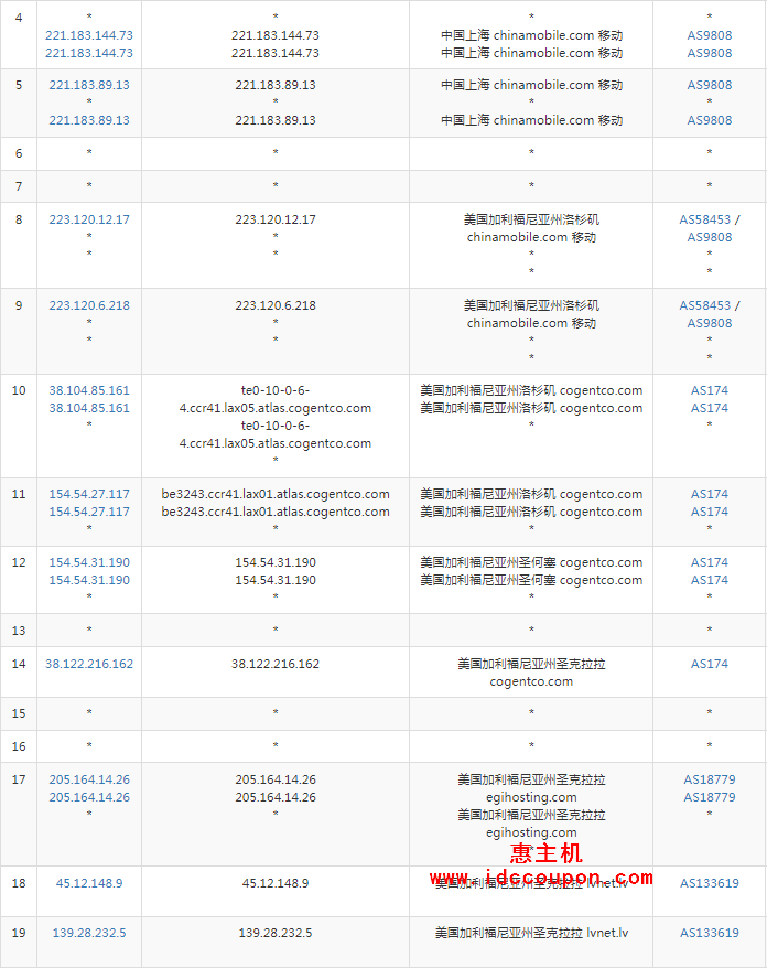 移动去程路由节点测试,移动CMI直连洛杉矶节点,然后转cogentco网络到达机房: