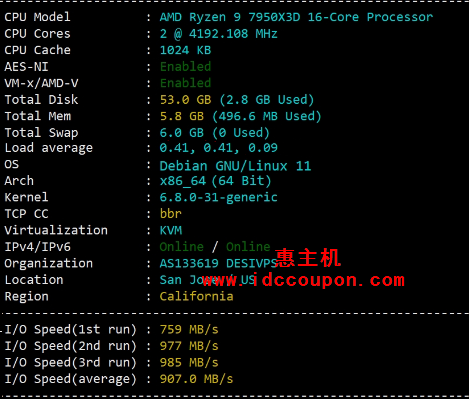 为满足对高性能应用使用需求,DesiVPS在十月份推出高配置AMD Ryzen7590系列美国VPS方案,位于圣何塞机房,并配备DDR5、NVMe SSD阵列硬盘,支持10Gbps带宽,看起来非常高大上。