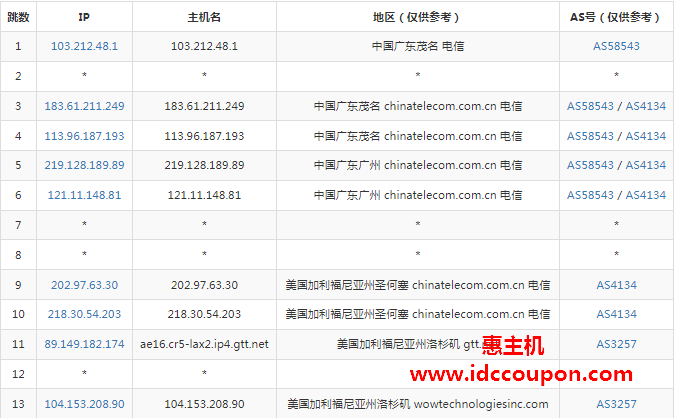 电信去程路由节点测试,电信163骨干网直连圣何塞节点,然后转gtt线路到达洛杉矶机房: