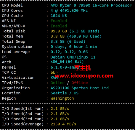 测试方案配置:AMD Ryzen 9 7950X CPU(4核心、主频4.5GHz),4GB内存,200Mbps带宽,IP归属美国西雅图,已开启BBR,硬盘I/O读写大概2.15GB/s: