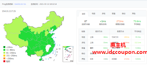 国内部分地区ping延迟测试,平均延迟75ms的样子,速度已经相当可以了: