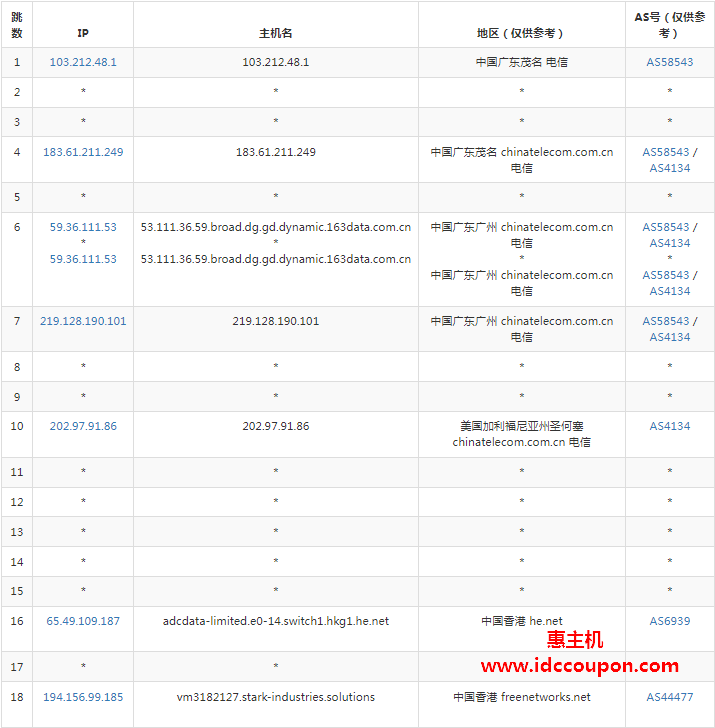 电信去程路由节点测试,电信163骨干网直连圣何塞节点,然后转he线路到达香港机房: