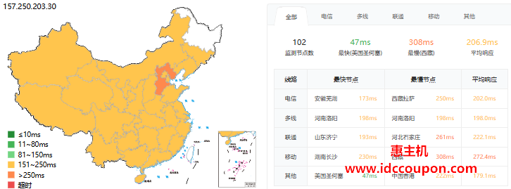 国内部分地区ping延迟测试,平均延迟206ms的样子,走的是普通国际带宽线路: