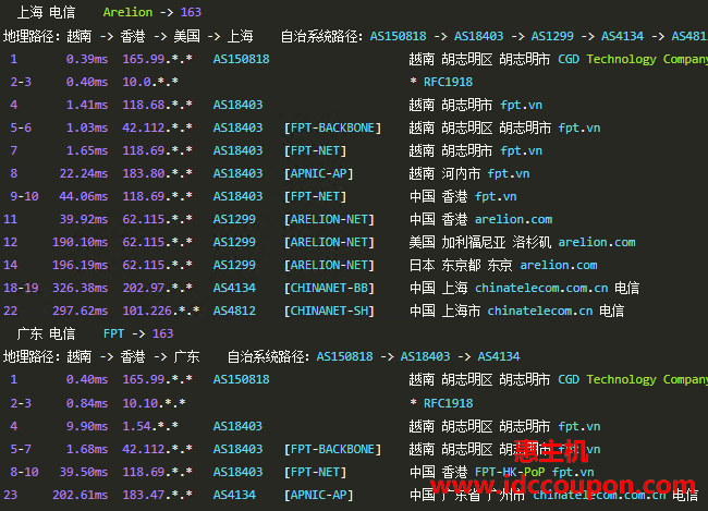 联通回程路由节点,走fpt网络到达香港节点,然后对接联通AS4837线路回到内地(南方地区走arelion网络绕道洛杉矶、大阪再回来):