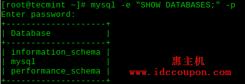 11、数据库安全设置完成之后,可以使用以下命令连接到MySQL并查看数据库服务器上的现有数据库。
